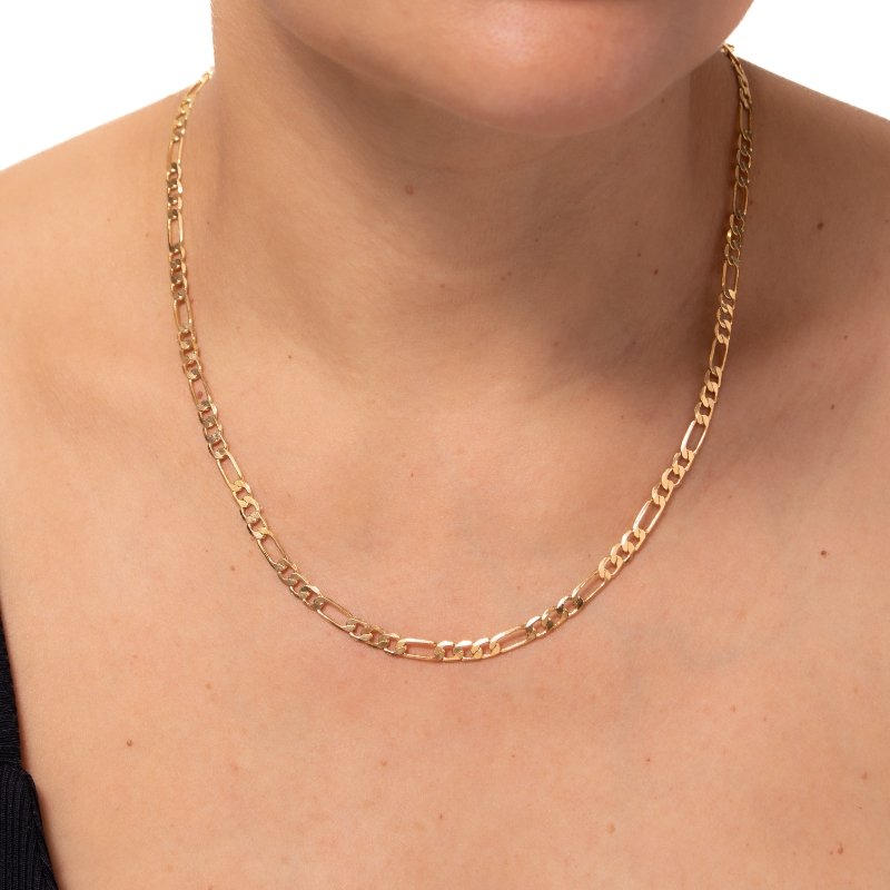 Colar Fígaro 5mm com fecho lagosta, clássico e versátil para compor looks modernos.Brincos e piercing fake: 5 milésimos de Ouro 18k.
