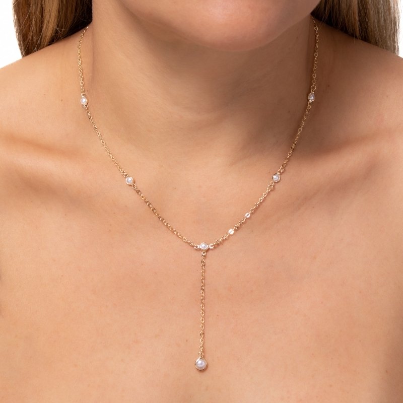 Colar gravata cadeadinho com pérolas, design moderno e elegante que valoriza o colo com delicadeza.Brincos e piercing fake: 5 milésimos de Ouro 18k.