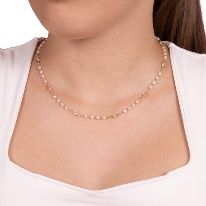 Colar pérola 3mm com zircônia 4mm e fecho lagosta, 40/45cm, uma combinação clássica e sofisticada que ilumina o seu visual com elegância.Brincos e piercing fake: 5 milésimos de Ouro 18k.