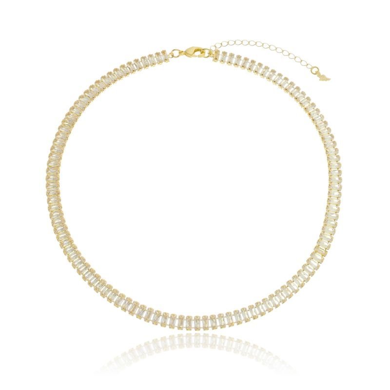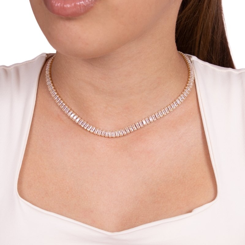 Colar Riviera com zircônias baguete de 5mm e fecho lagosta, elegância e brilho em cada detalhe.Brincos e piercing fake: 5 milésimos de Ouro 18k.