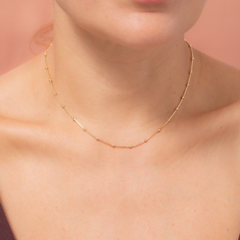 Colar Veneziana com bolinhas espaçadas de 1,5?cm, ideal para mix de colares com toque delicado e moderno.Brincos e piercing fake: 5 milésimos de Ouro 18k.