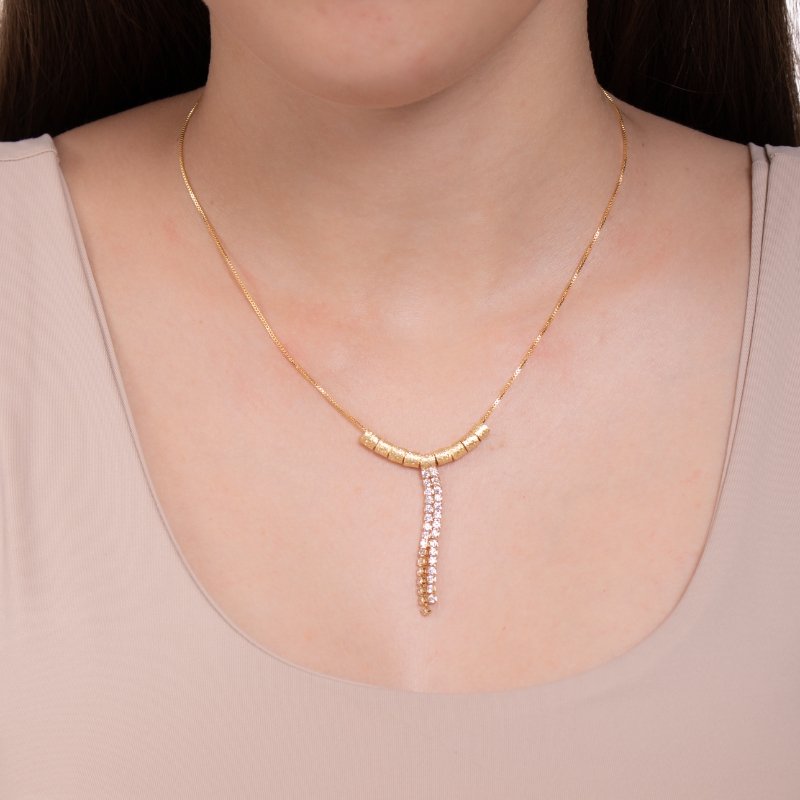 Colar Veneziana com Riviera 30/40cm: combinação clássica e sofisticada, ideal para compor mix de colares com brilho sutil.Brincos e piercing fake: 5 milésimos de Ouro 18k.