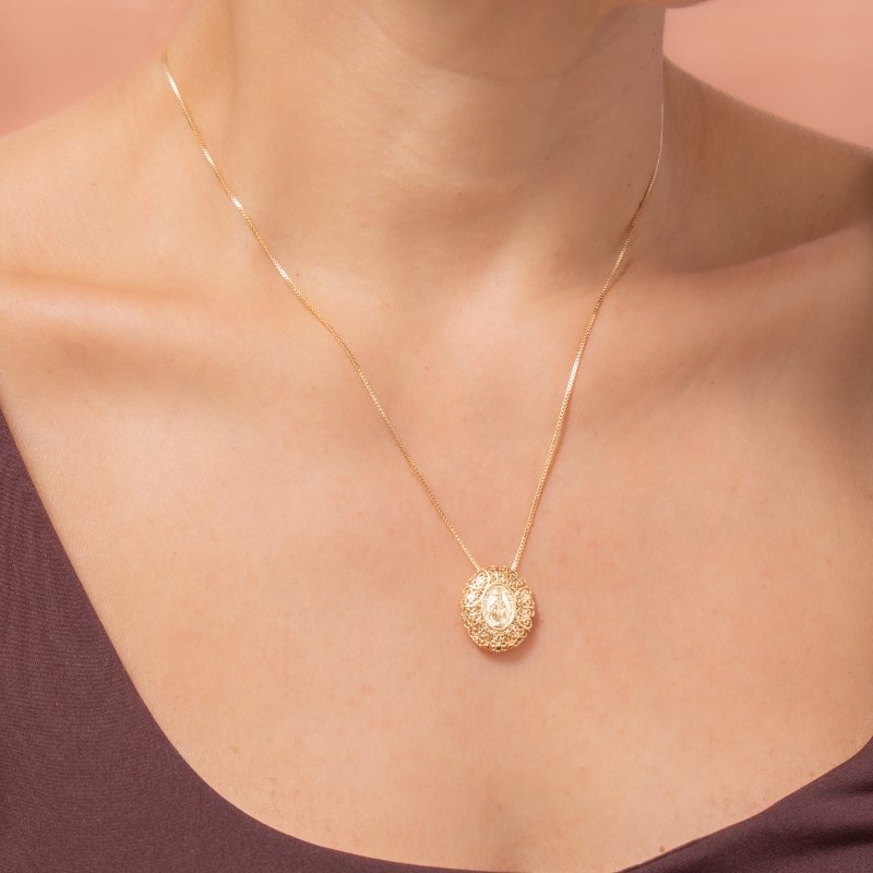 Colar Veneziana Nossa Senhora das Graças 40/45cm, fé e proteção com delicadeza e brilho sutil.Brincos e piercing fake: 5 milésimos de Ouro 18k.