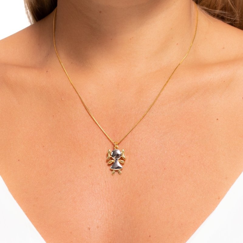 \"Colar Veneziana com Pingente Menina Bicolor 40/45cm: Delicadeza e estilo em uma peça charmosa para todas as ocasiões.\"Brincos e piercing fake: 5 milésimos de Ouro 18k.
