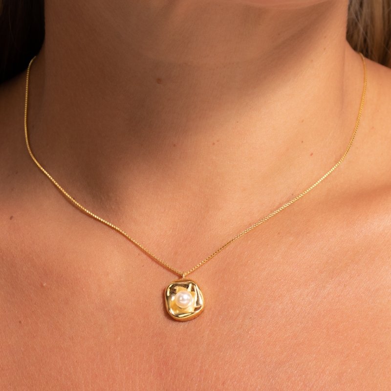 Colar veneziana com pingente orgânico e pérola de 6mm, uma peça elegante e atemporal para complementar seu estilo.Brincos e piercing fake: 5 milésimos de Ouro 18k.
