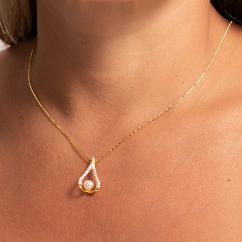 Colar Veneziana com gota cravejada e pérola de 6mm, perfeito para um toque sofisticado e elegante.Brincos e piercing fake: 5 milésimos de Ouro 18k.