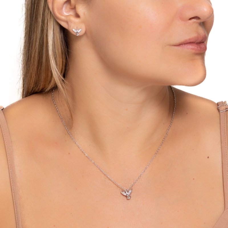 Conjunto Espírito Santo cravejado 40/45cm, delicado e sofisticado, ideal para momentos de elegância e fé.Brincos e piercing fake: 5 milésimos de Ouro 18k.