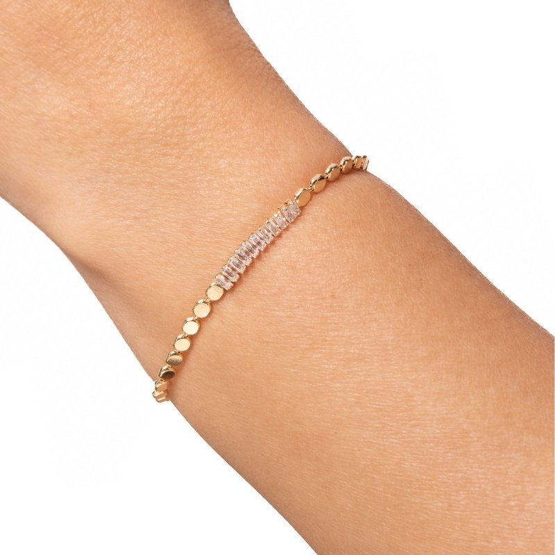 Pulseira bolinha com riviera baguete: combinação delicada de charme e brilho para qualquer ocasião.Brincos e piercing fake: 5 milésimos de Ouro 18k.