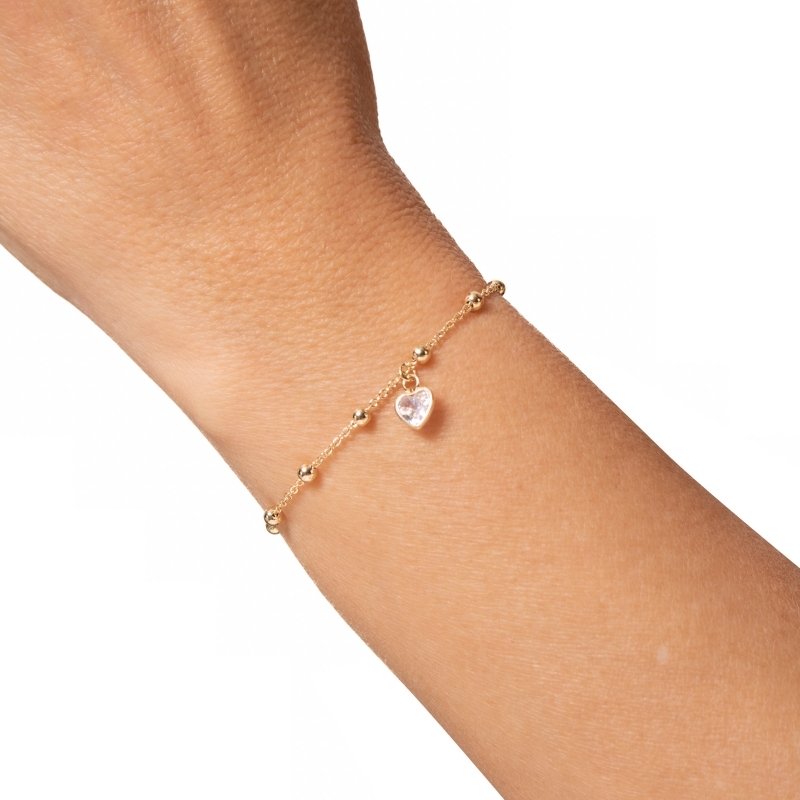 Pulseira de bolinhas com coração em zircônia 9mm, delicadeza e brilho na medida certa.Brincos e piercing fake: 5 milésimos de Ouro 18k.