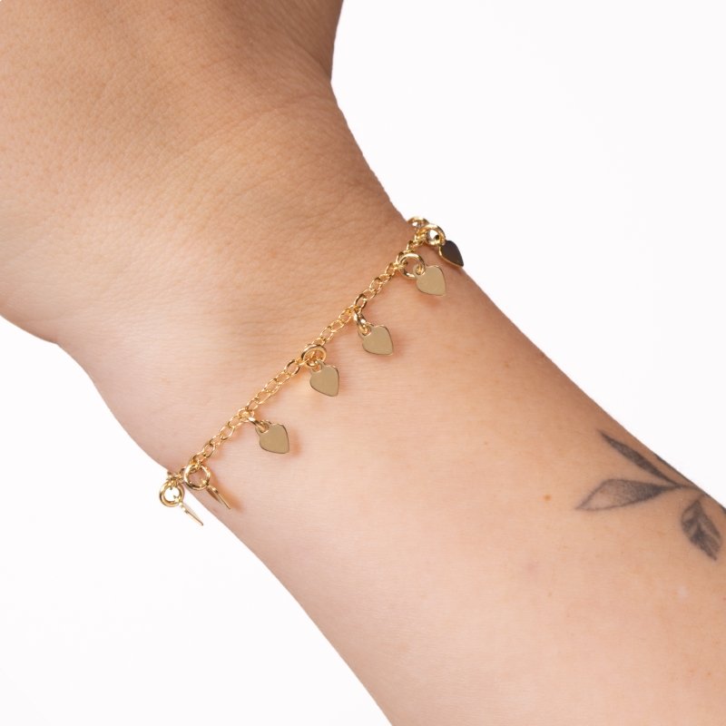 Pulseira cadeadinho com pendulicários de coração, charme e leveza em cada detalhe.Brincos e piercing fake: 5 milésimos de Ouro 18k.