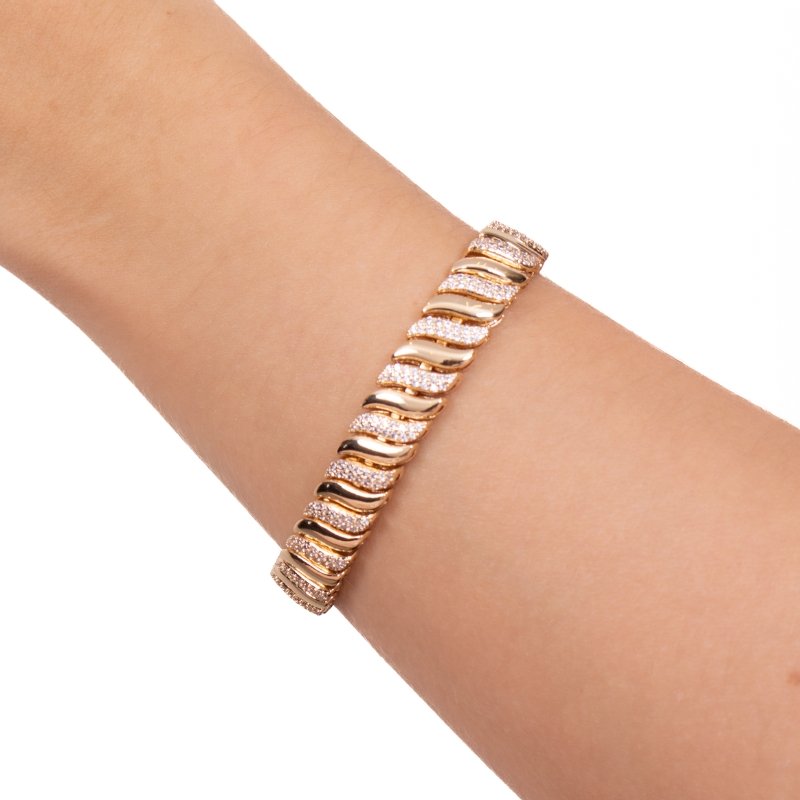 Pulseira com detalhes em ondas e zircônias, elegante e moderna para compor qualquer produção.Brincos e piercing fake: 5 milésimos de Ouro 18k.