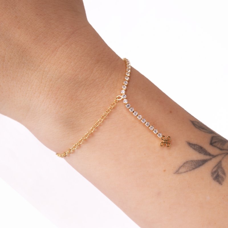 Pulseira duas malhas com flor vazada, leve e charmosa, ideal para compor um look delicado e moderno.Brincos e piercing fake: 5 milésimos de Ouro 18k.