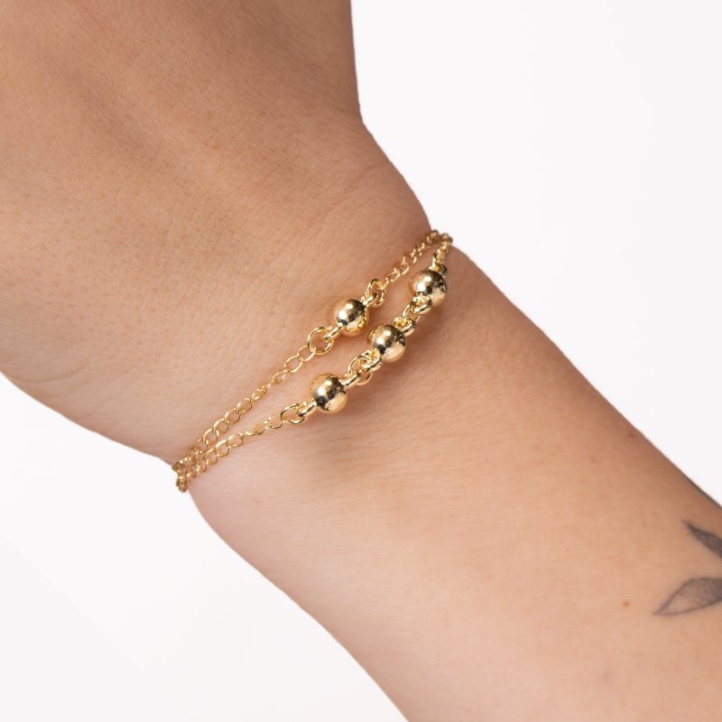 PULSEIRA DUPLA ELO GRUME COM BOLAS LISAS: elegância e estilo em uma peça versátil e moderna.Brincos e piercing fake: 5 milésimos de Ouro 18k.