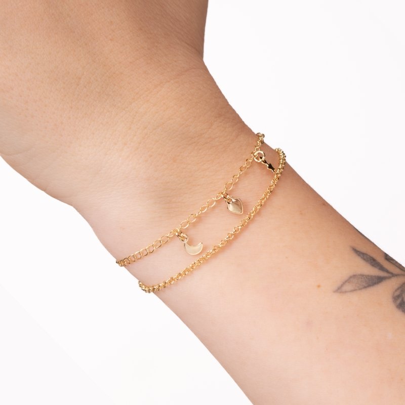 Pulseira Elo Português Dupla com pendulicários diversos, estilo versátil e cheio de personalidade para compor mix modernos.Brincos e piercing fake: 5 milésimos de Ouro 18k.