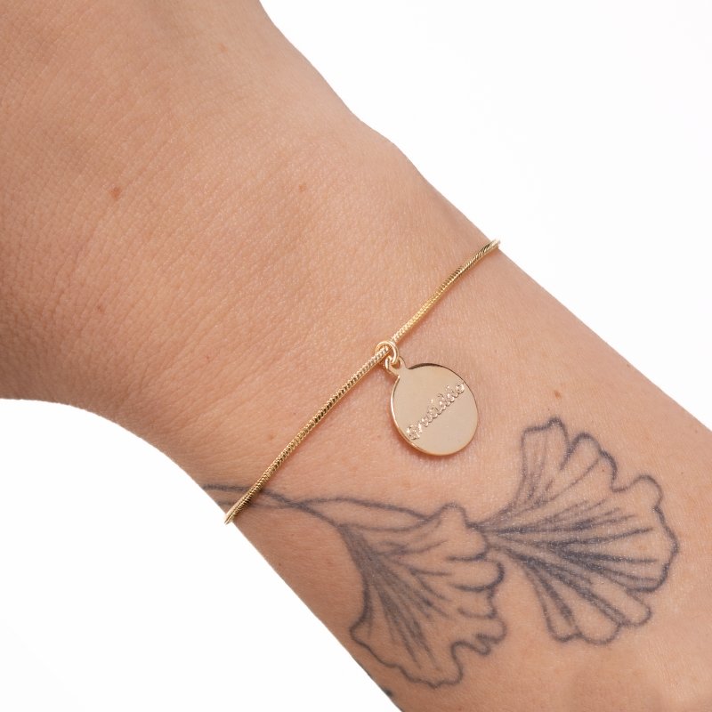 Pulseira rabo de rato com medalha Gratidão e fecho pneu, perfeita para revenda com toque delicado e simbólico.Brincos e piercing fake: 5 milésimos de Ouro 18k.
